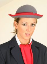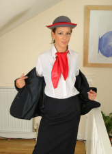 Aged Brit Molly Maracas dons her stripy red-n-black satin corset and lacy nylons for loud toy play