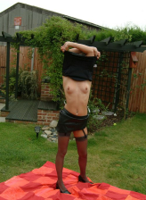 Hana Black wears a sexy red corset with black nylons and platform heels to play