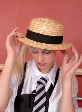 Lolly Badcock in schoolgirl uniform with a straw hat and white stockings