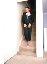 Hot mature Charlotta Rose strips her pink air hostess uniform and black lingerie to pose in fishnets