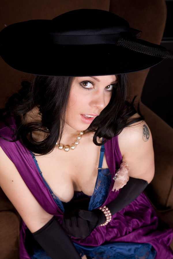 Smart retro lady Lucy Mae boasts her naughty open crotch corset and FF stockings