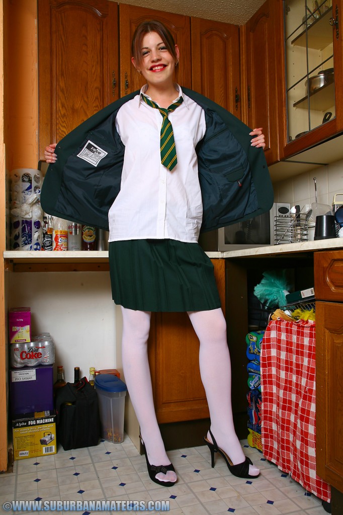 SuburbanAmateurs - UK teen Isabella Kay plays in her school uniform, pulling down her panties and fingering her cunt in her stockings