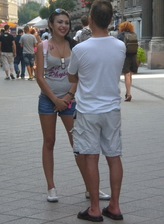 White-stockinged and ponytailed cheerleader handles an old pecker